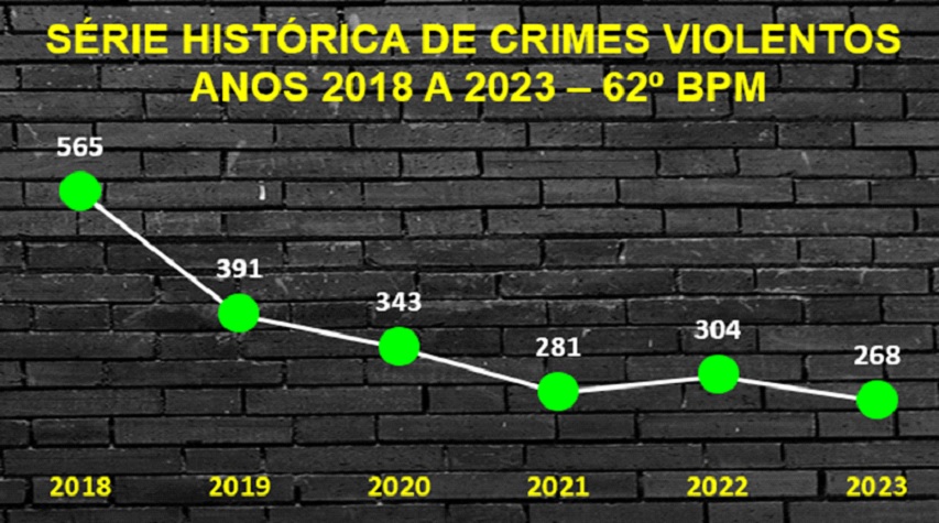 No ano 2023, a redução de crimes violentos foi de 12%, em relação ao ano 2022, como pode ser visto no gráfico. “A referida redução trata-se de marco histórico, pois se refere ao menor número de crimes violentos já registrados pela Unidade, desde sua elevação a condição de Batalhão PM”, pondera o comando.