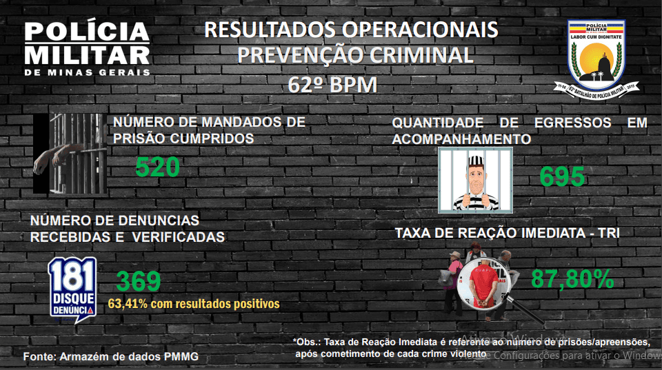 369 denúncias foram recebidas e verificadas por meio do 181, com mais de 63% de resultados positivos; além de 520 mandados de prisão cumpridos, tendo assim a Polícia Militar retirado de ação um grande número de infratores com potencial para o cometimento de delitos em nossa comunidade.