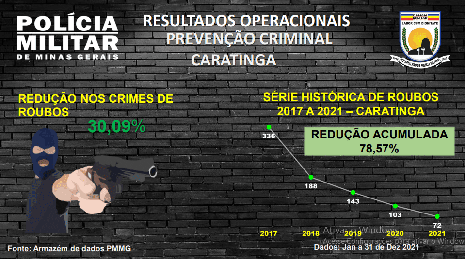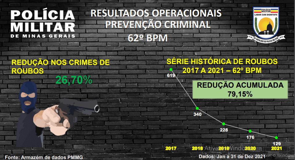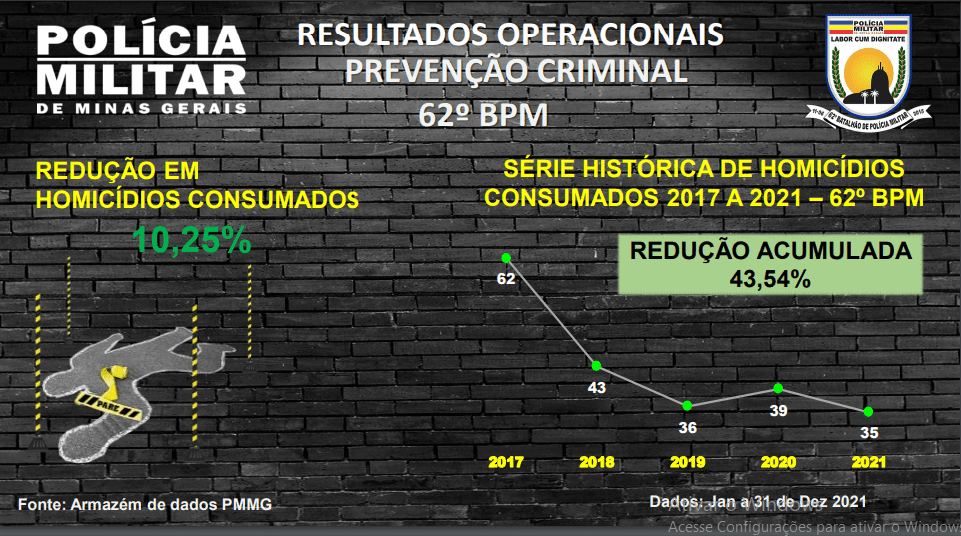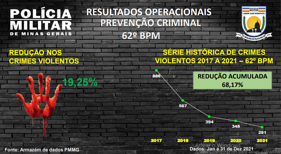 De acordo com os dados apresentados, em 2021, o Batalhão conseguiu reduzir em 19,25% os crimes violentos, o que equivale a 67 crimes violentos a menos que o ano anterior, além de ser o melhor ano em uma série histórica que leva em consideração os últimos cinco anos, quando a Unidade vem experimentando reduções ano a ano, desde 2017 e, “em 2021, alcançou a marca expressiva de redução de 68,17% em relação ao ano de 2017, com o registro de menos 587 crimes violentos”.