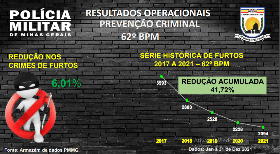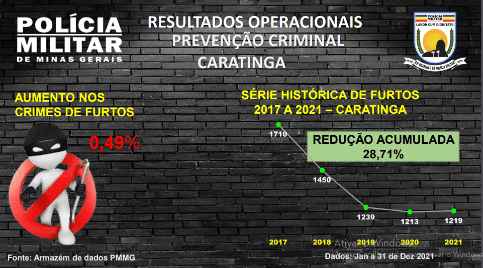 De acordo com o oficial, outro aspecto importante foi a redução nos crimes de furtos, na ordem de 6,01%, com 134 crimes a menos que o ano anterior e redução acumulada de 41,72%, com 1.500 crimes a menos em relação ao ano de 2017. “Essa importante redução, que impacta diretamente na sensação de segurança de nossa comunidade, ocorreu por meio de ações que demonstram sucesso na prevenção criminal, destacando-se a campanha “Foco na Prevenção” e medidas estratégicas focadas no problema, bem como em infratores contumazes e reincidentes nesse delito”.