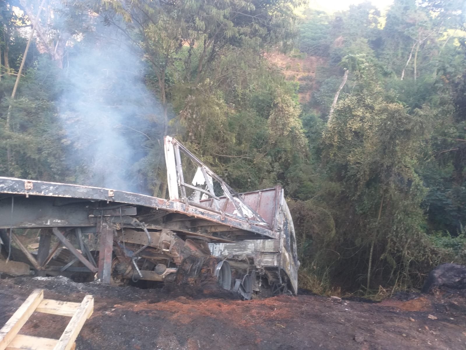 Assim que os bombeiros militares chegaram ao local, constaram que a carreta havia descido em uma ribanceira e que estava em chamas. O motorista conseguiu escapar, mas tinha escoriações pelo corpo. Ele foi conduzido pela equipe da concessionária EcoRioMinas e levado para o Hospital César Leite, em Manhuaçu, para melhor ser avaliado seu quadro clínico.