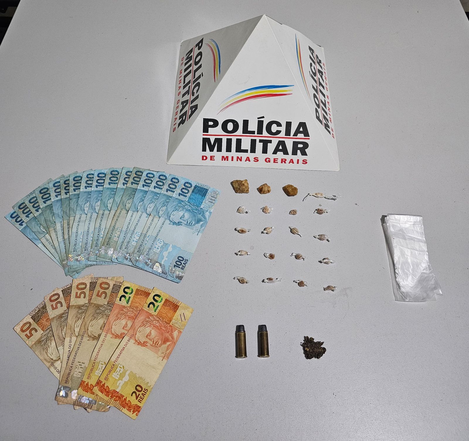 Durante as buscas foram localizadas 20 pedras de crack, duas munições calibre 44, um telefone celular e R$1.840,00.