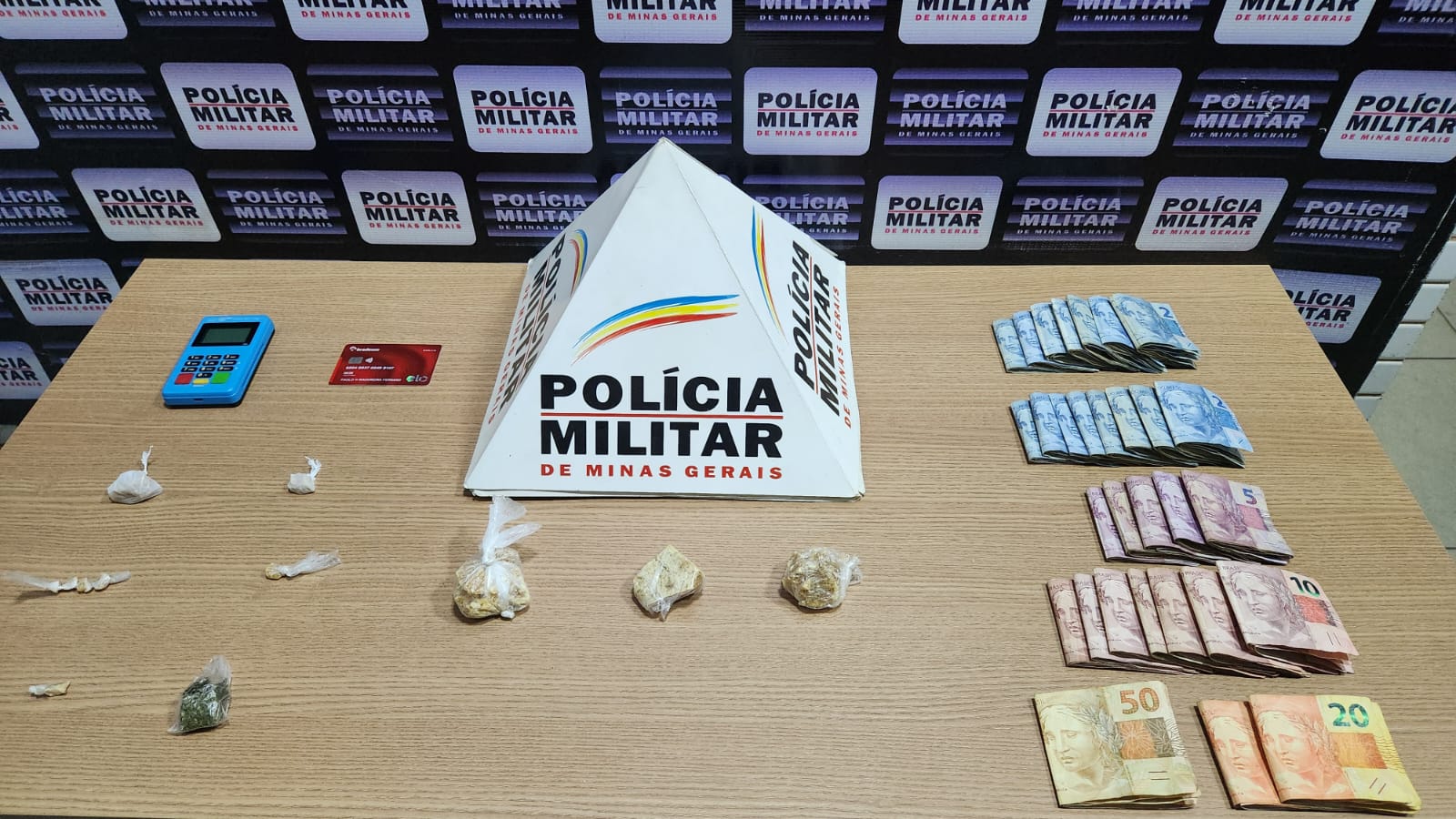 Em continuidade foram apreendidos na residência de um dos menores, três porções grandes de crack, oito pedras, uma bucha de maconha, uma máquina de cartão, um cartão de débito e R& 1.054,00.