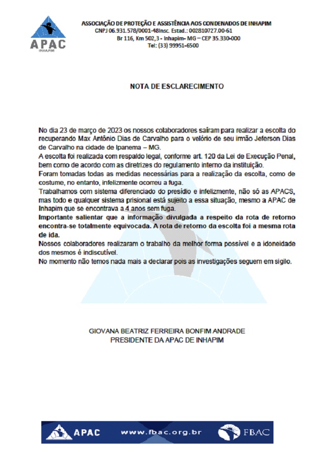 A respeito dessa situação, a Apac de Inhapim emitiu a seguinte nota: