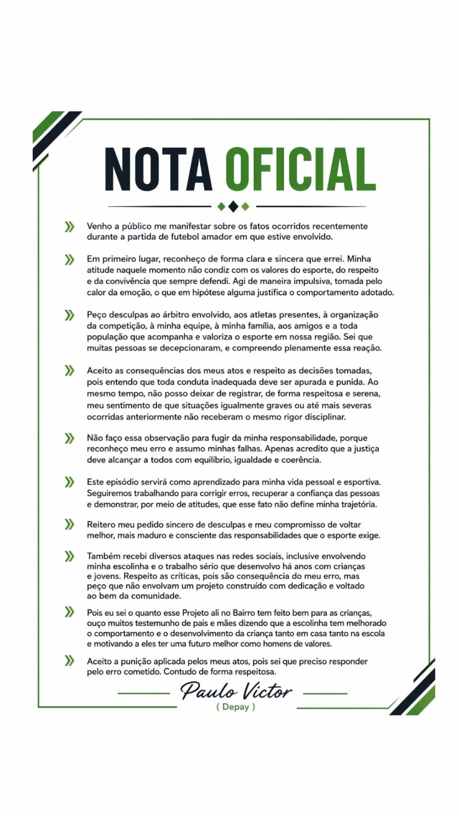 Ainda na manifestação, Paulo Vitor destaca sua atuação em projetos sociais com crianças e jovens e afirma que o episódio não representa sua trajetória, defendendo que a situação sirva como aprendizado pessoal e esportivo.