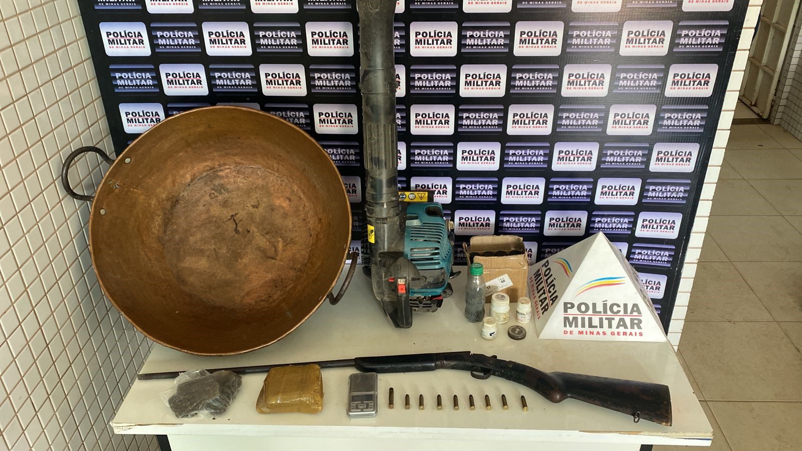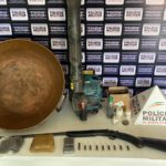 Durante os trabalhos, os policiais apreenderam uma espingarda calibre 38, seis munições, um cartucho de fabricação caseira, diversos frascos contendo pólvora e esferas, uma barra de maconha e seis tabletes de maconha. Também foram recuperados um tacho de cobre e um soprador elétrico.