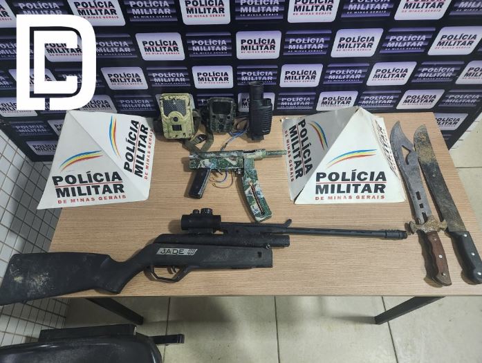 uma submetralhadora artesanal, um carabina Jade, dois facões, um monóculo e duas câmeras para caça.