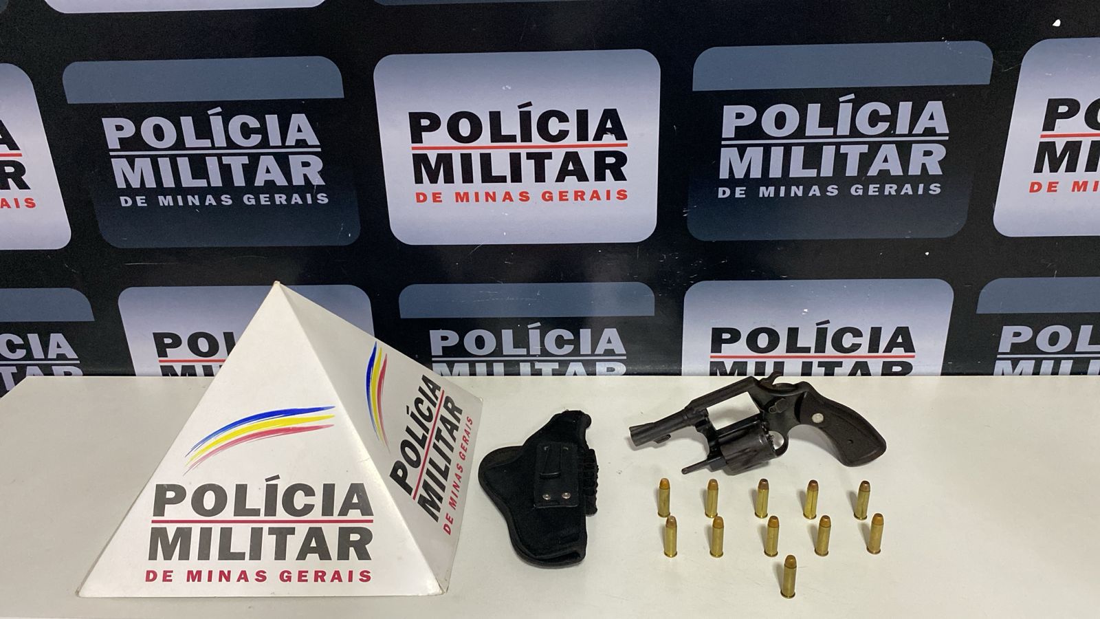 Durante a abordagem ao indivíduo, um homem de 20 anos, conhecido no meio policial por envolvimento com grupos criminosos ligados ao tráfico de drogas, foram encontrados UM revólver calibre .38, 11 munições intactas do mesmo calibre e um coldre.