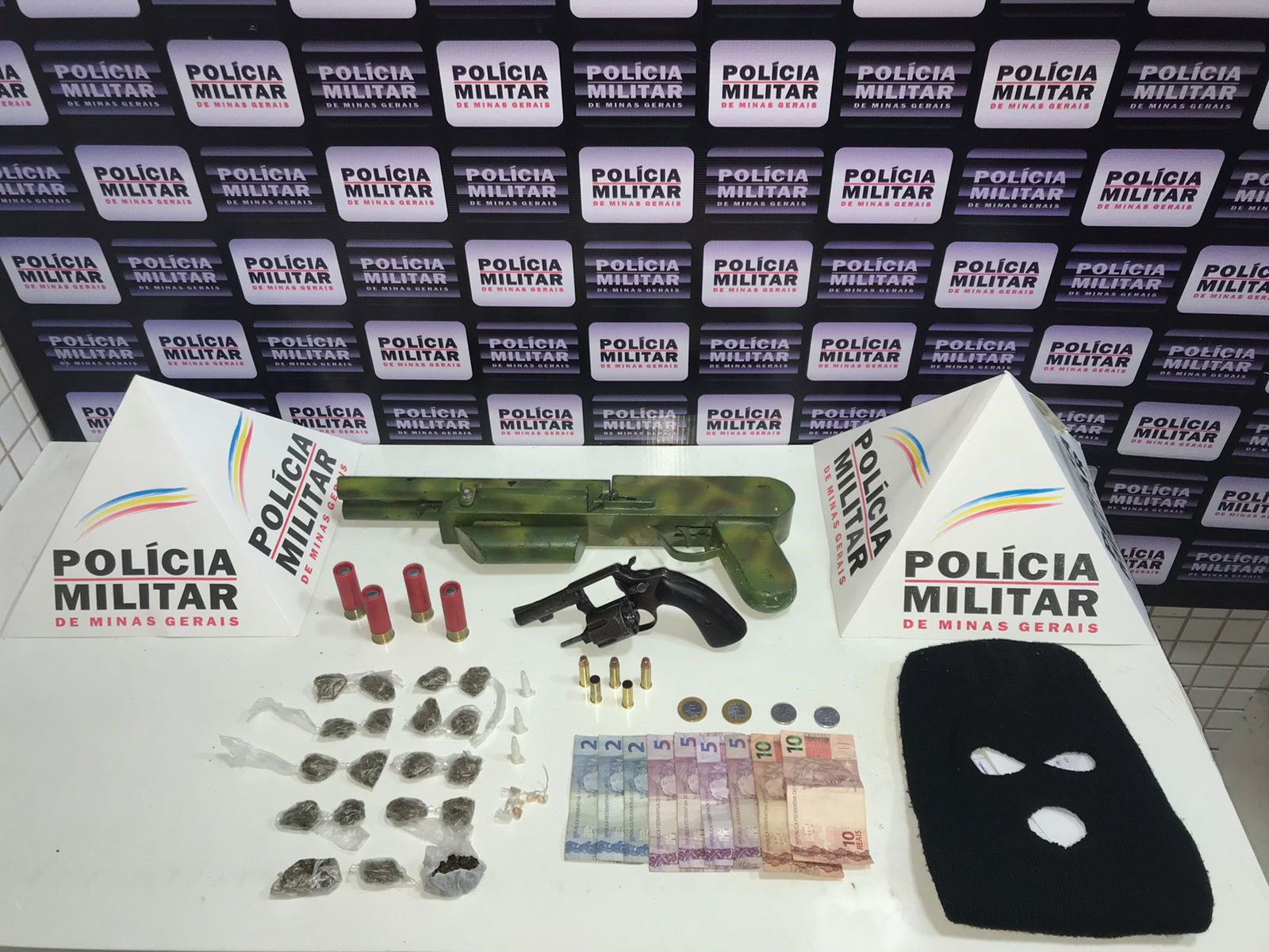 Na residência denunciada e durante a abordagem dos dois indivíduos de 18 anos, foi lançado pela janela um revólver calibre 38. Os suspeitos foram contidos e durante as diligências foram apreendidos dentro da residência uma espingarda calibre 12 e quatro munições do mesmo calibre, três munições calibre 38, 19 buchas de maconha, seis pedras de crack, três cápsulas cocaína e R$ 49,00.