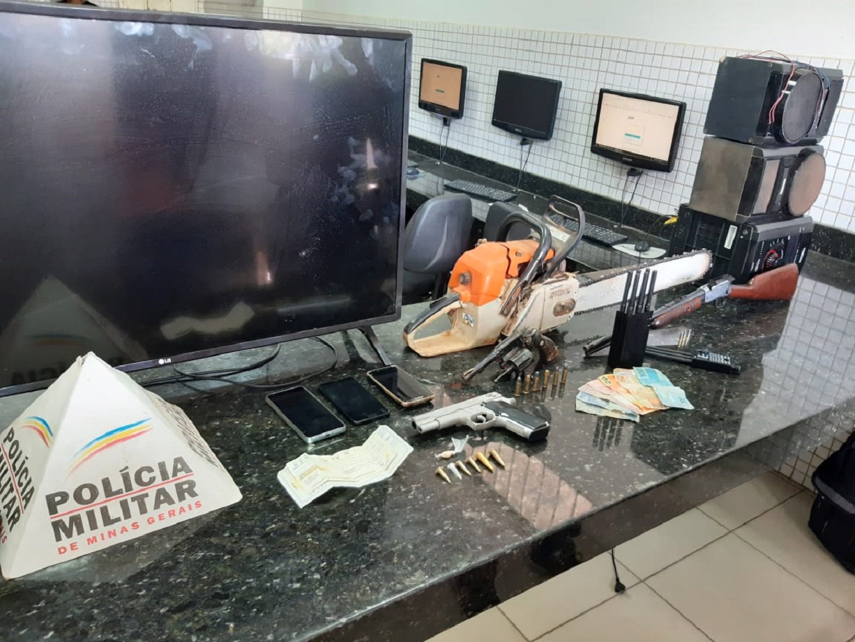 Dentro do veículo que foi levado da vítima uma réplica de pistola, e na propriedade rural foram encontradas munições, uma arma de fogo, e objetos subtraídos da vítima.