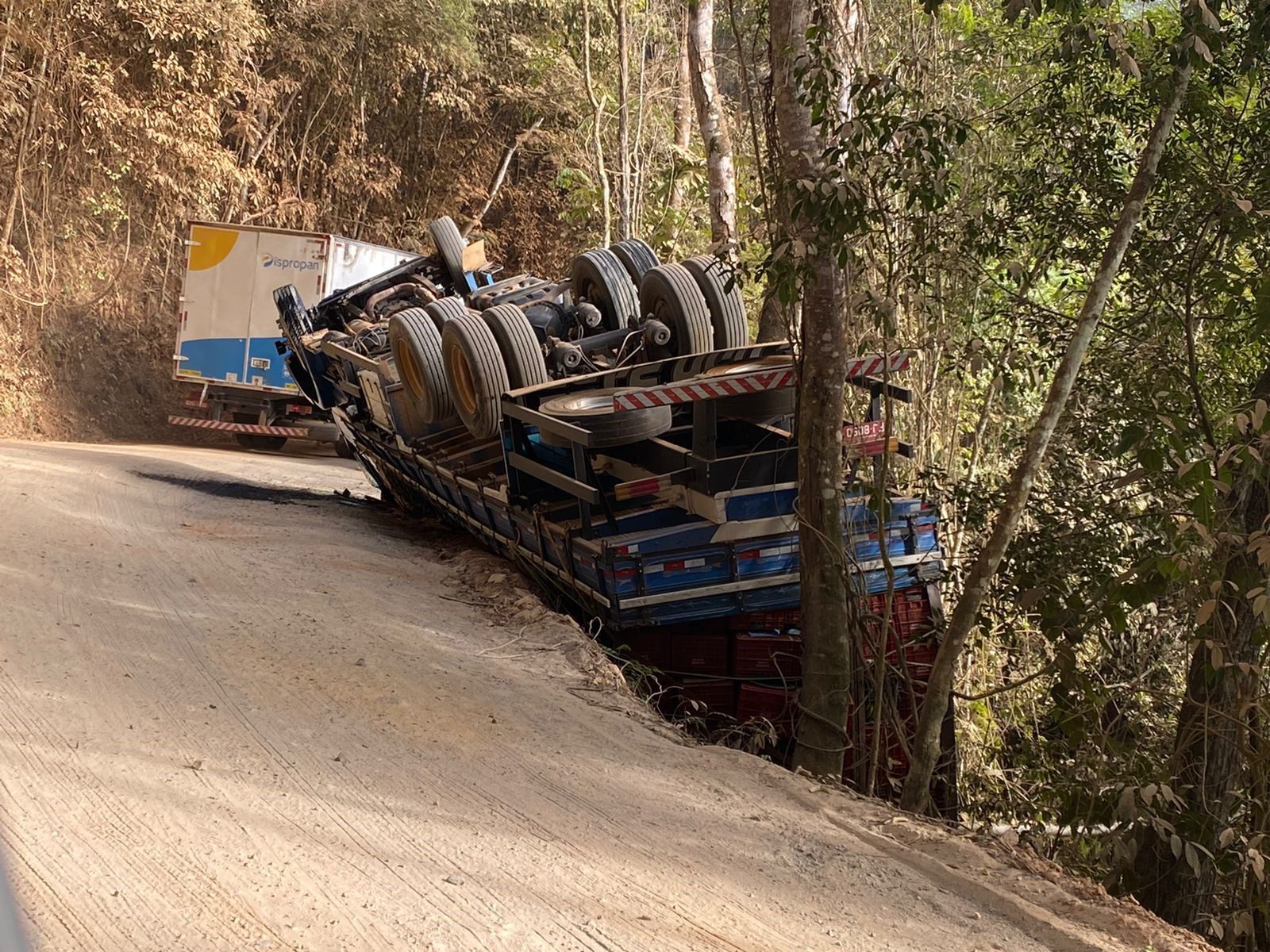 CARATINGA – Na manhã desta quarta-feira (29), um caminhão carregado com bananas tombou no trecho que corta a RPPN Feliciano Miguel Abdala, no município de Caratinga.