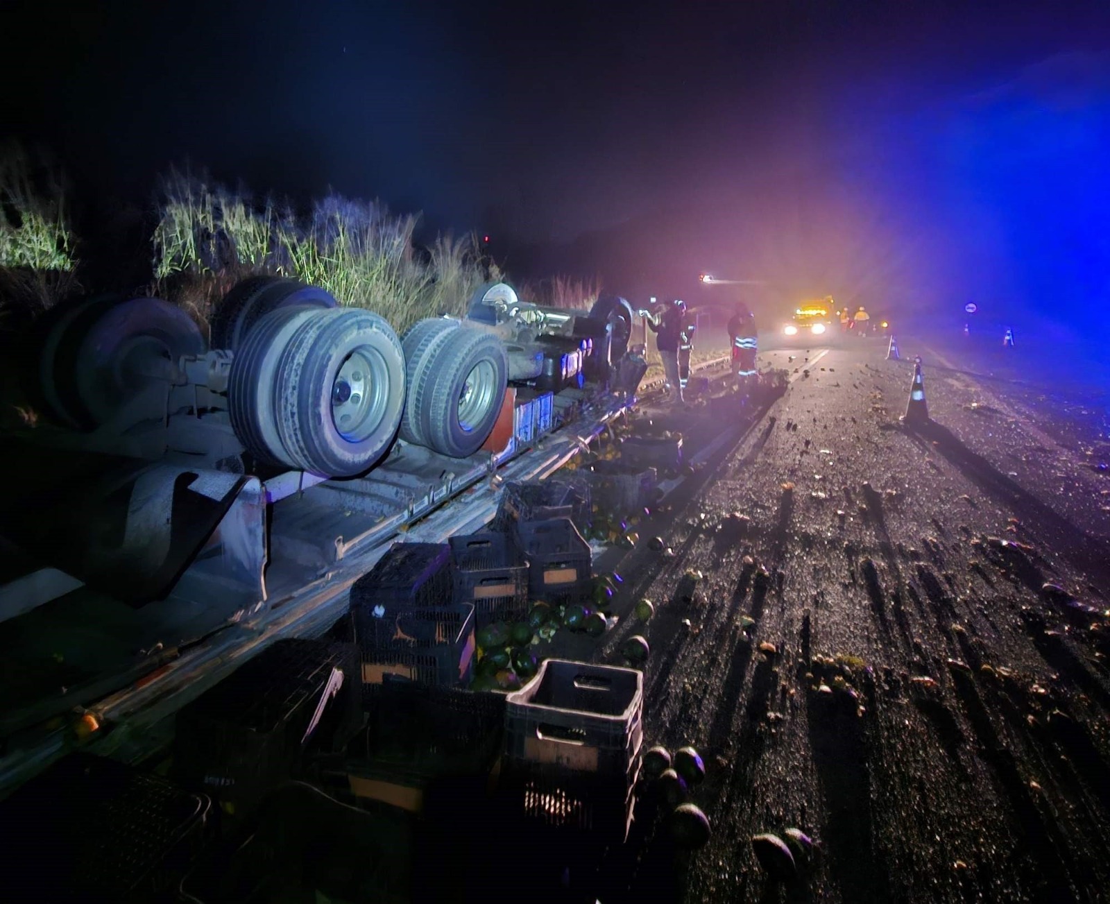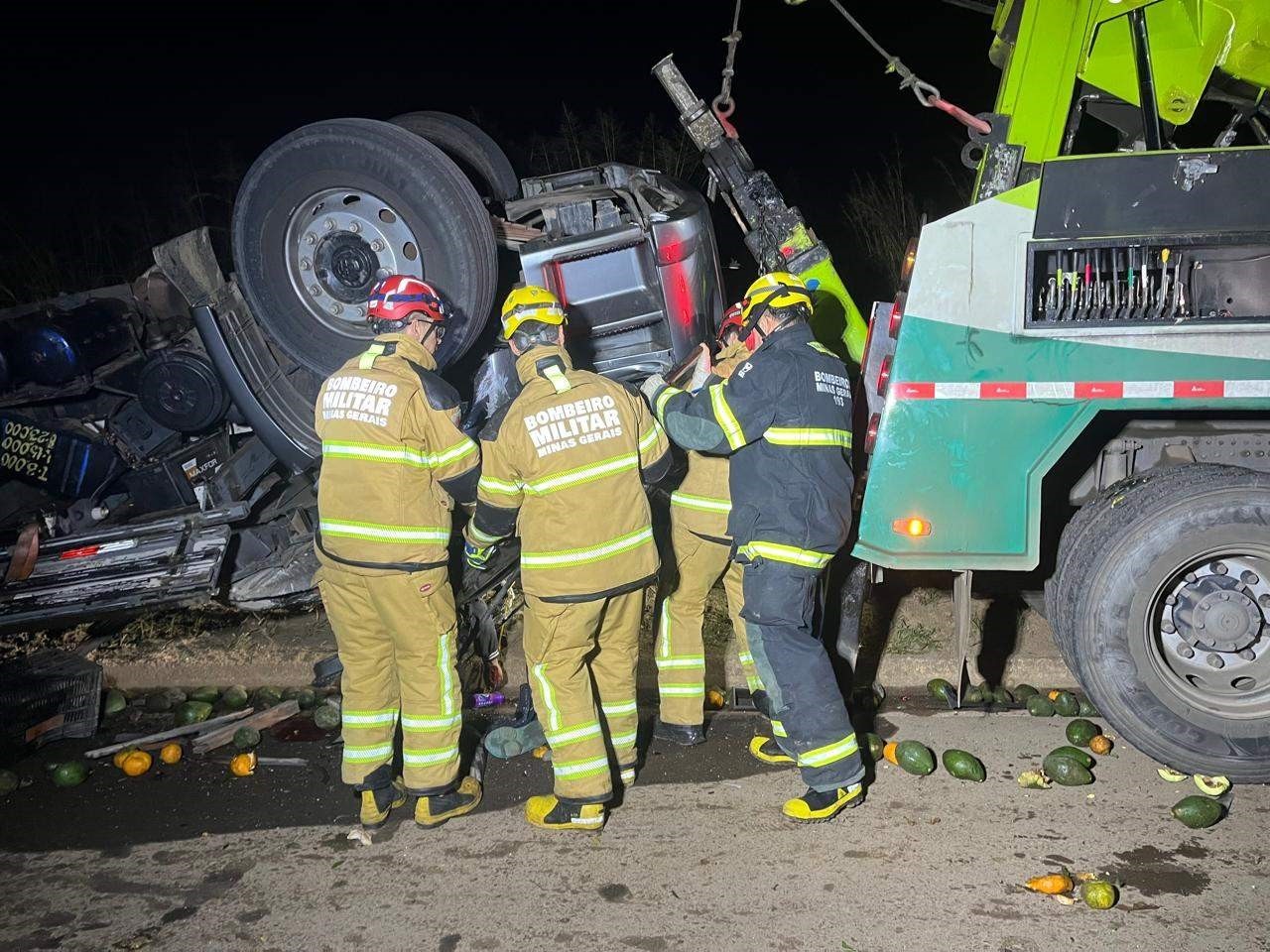 Veículo carregado com abacate e mexerica tombou na pista; motorista ficou preso na cabine