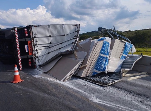 Conforme o registro da Polícia Rodoviária Federal, a carreta tombou e atingiu uma motocicleta Pop 100 com dois ocupantes, que transitava no acostamento.
