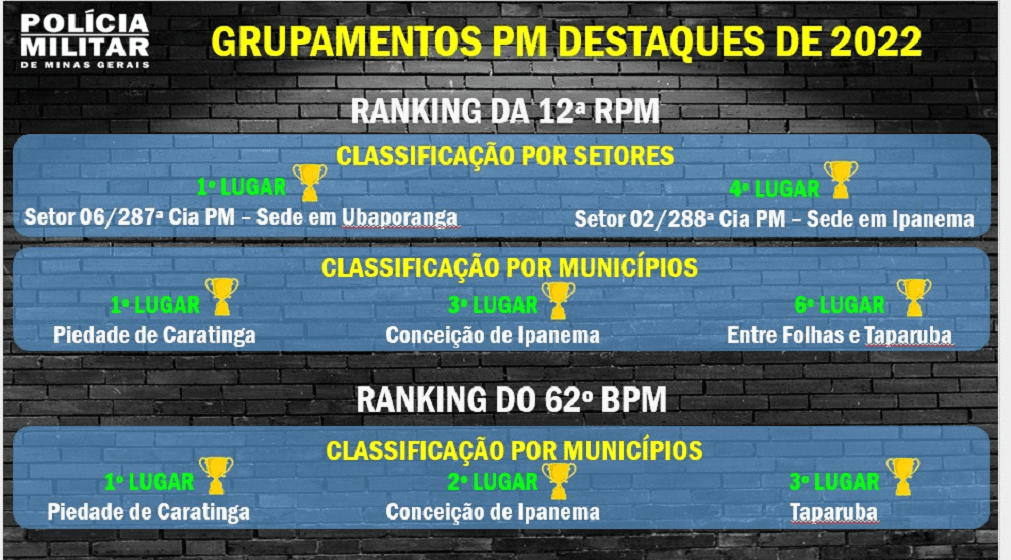 Dos números apresentados pelo comandante do Batalhão, destacam-se os grupamentos no ranking da 12ª Região de Polícia Militar, ficando em primeiro lugar, Ubaporanga e em 4º lugar, Ipanema. Por municípios, Piedade de Caratinga em primeiro, Conceição de Ipanema em terceiro, Entre Folhas e Taparuba empataram no 6º lugar.