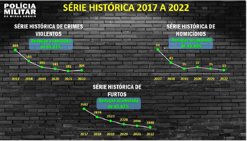 Os números, segundo o comandante, também foram positivos numa série histórica que é realizada desde 2017. Nos crimes violentos a redução de 2017 para 2022 de 65,61%, homicídios, no mesmo período a redução foi de 45,90% e furtos, 45,62%.