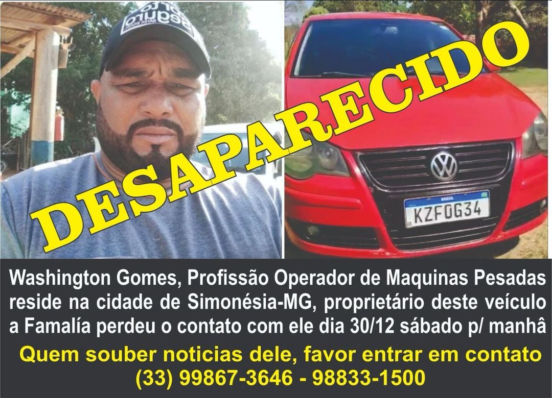 DESAPARECIDO – Washington Gomes de Oliveira, 46 anos, é natural de Governador Valadares, hoje reside em Simonésia, onde trabalha como operador de máquinas, porém está desaparecido, sendo visto pela última vez no sábado 30/12, próximo ao seu apartamento no Bairro Bela Vista, em companhia de seu cachorro e segundo populares, teria saído em seu veículo, um VW Polo, vermelho.