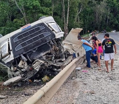 A carreta tombou e o motorista morreu no local, preso às ferragens. Equipes do Corpo de Bombeiros de Manhuaçu e da Polícia Rodoviária Federal de Muriaé foram acionadas para atender a ocorrência. Resgate da EcoRioMinas e a perícia da Polícia Civil de Muriaé também foram acionadas.