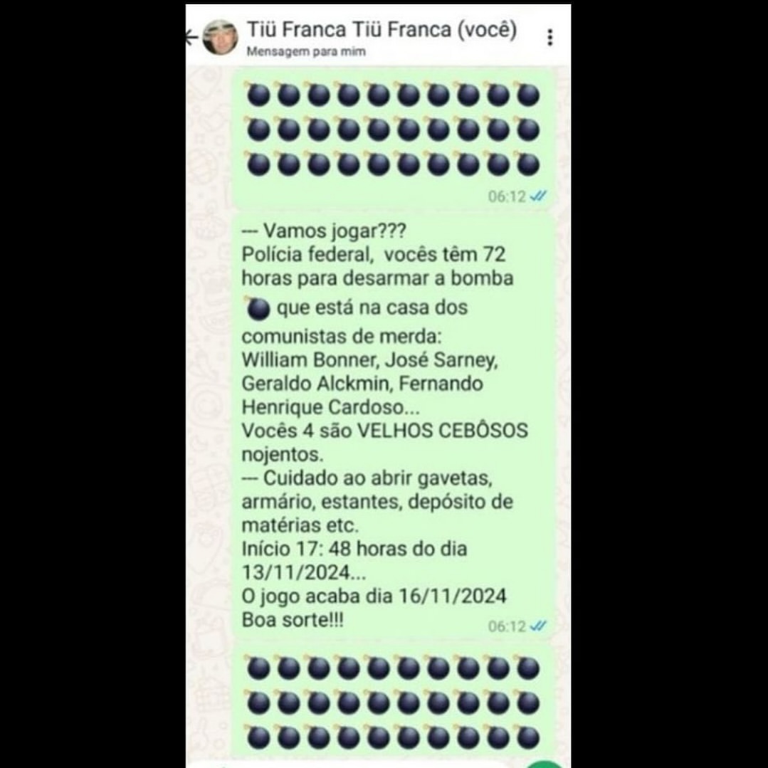 “Vamos jogar??? Polícia Federal, vocês têm 72 horas para desarmar a bomba que está na casa dos comunistas de merda: William Bonner, José Sarney, Geraldo Alckmin, Fernando Henrique Cardoso. Vocês 4 são VELHOS CEBÔSOS nojentos”, escreveu.
