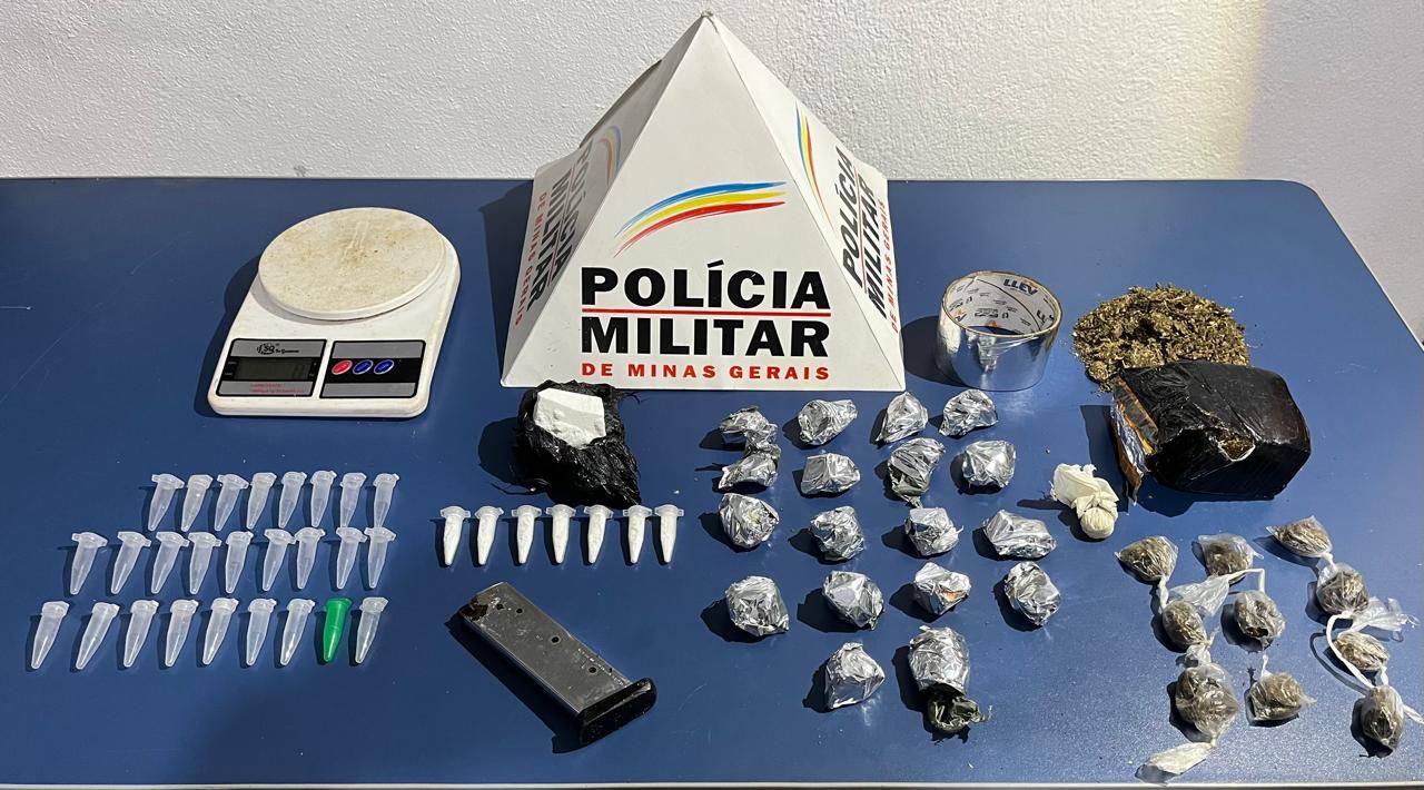 Com a chegada de reforços, uma varredura foi realizada, resultando na apreensão dos seguintes materiais, uma pedra e sete pinos de cocaína, 26 cápsulas para acondicionar drogas, mas vazias; uma porção, uma barra e dez buchas de maconha, um carregador de pistola cal. 45, uma balança de precisão e um rolo de fita adesiva para empacotar drogas