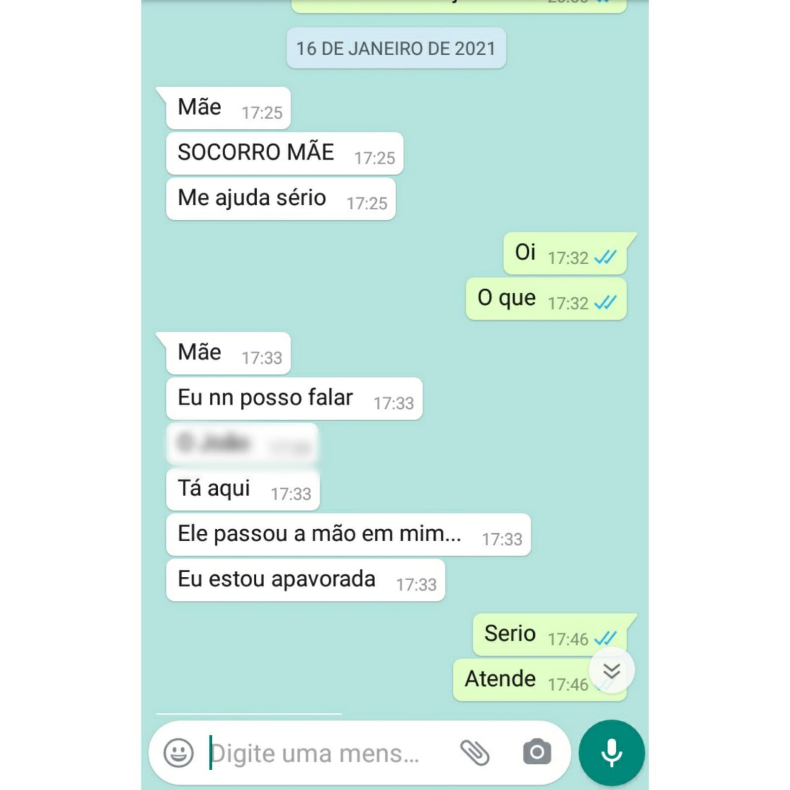 “No dia do fato, fui trabalhar no período da tarde, era um horário que eu nem tinha hábito de trabalho, foi uma troca que fiz com uma colega, que era aniversário de casamento. Por volta das 17h, ela me enviou uma mensagem via WhatsApp, colocando “Mãe, socorro, me ajuda”. Com isso já fiquei apavorada pensando que era algum acidente dentro de casa e retornei a ligação para ela, porém, ela não me atendia. Depois, ela mandou outra mensagem, que não podia falar, pois ele estava lá passando a mão nela, estava apavorada. Nesse momento, ela foi muito inteligente, fingiu que foi ao banho para me responder, para ele não perceber que ela estava em contato comigo.