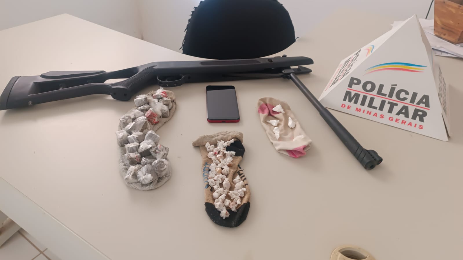 Equipes cumpriram um mandado de busca e apreensão em desfavor do autor. Após terminadas as buscas foram apreendidos cinco papelotes de cocaína, 23 tabletes de maconha, 31 pedras de crack, e uma espingarda.
