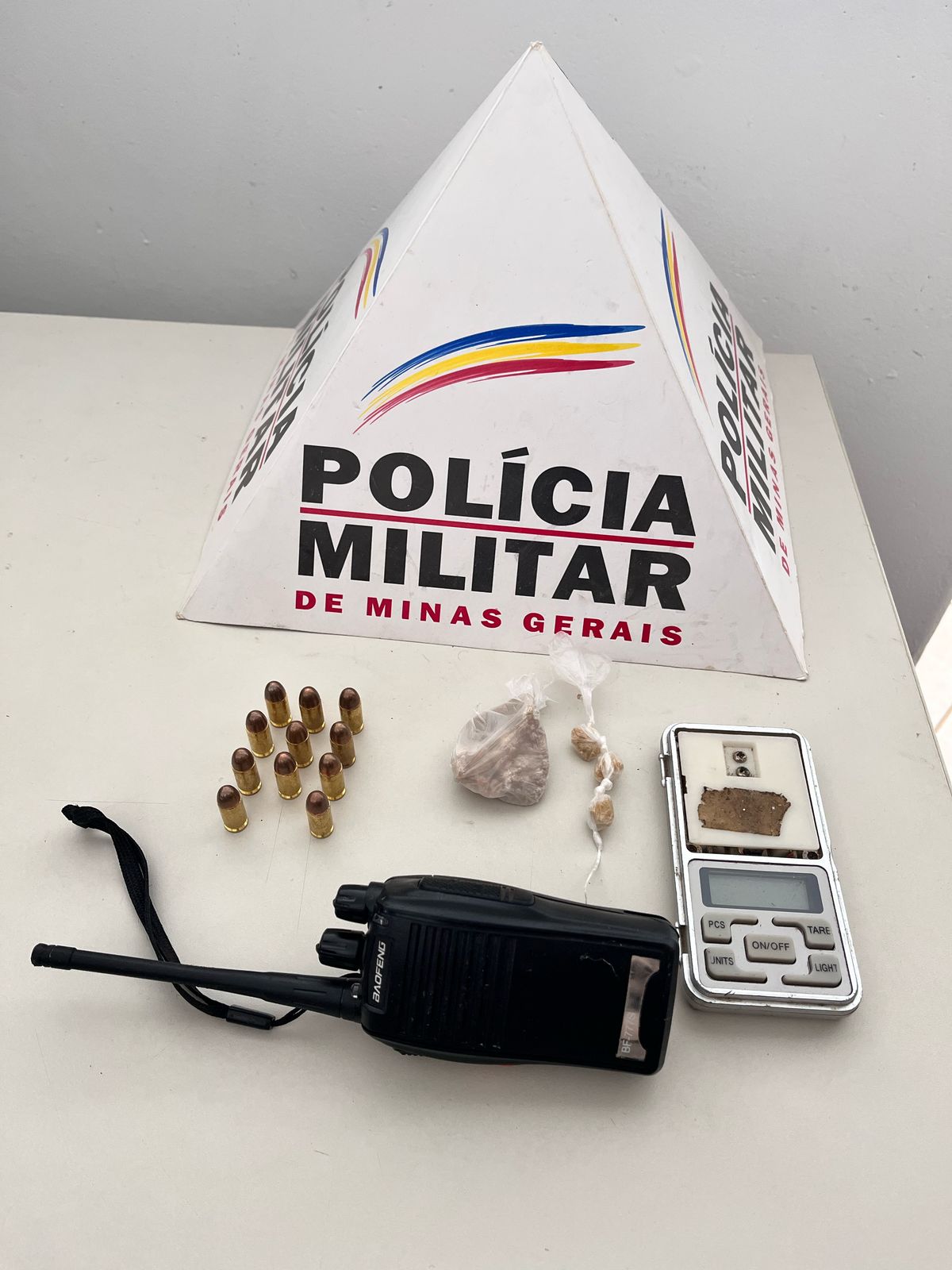 Com informações de que o indivíduo estaria traficando e, possivelmente, portando uma arma de fogo, a equipe obteve autorização do responsável para realizar uma busca residencial. Durante a busca, foram encontrado um rádio comunicador, onze munições calibre.380, três pedras pequenas de crack embaladas, uma pedra de crack com aproximadamente 20 gramas e uma balança digital.