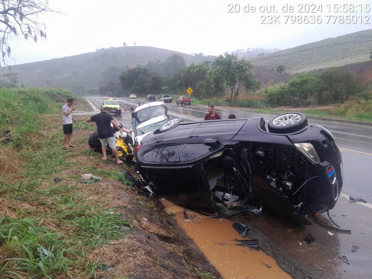 O grave acidente envolveu uma BMW e um Fiat Palio. A colisão foi tão violenta que destroços dos veículos ficaram espalhados pela pista, e o veículo BMW chegou a tombar.