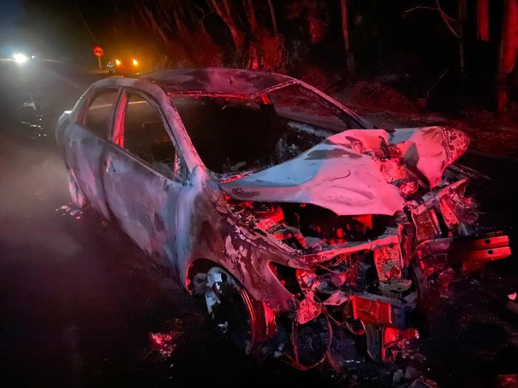 Devido a colisão o veículo Toyota Corolla pegou fogo, ficando totalmente incendiado. O motorista do carro não ficou ferido.