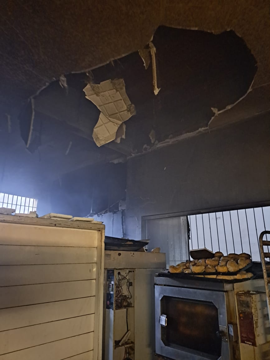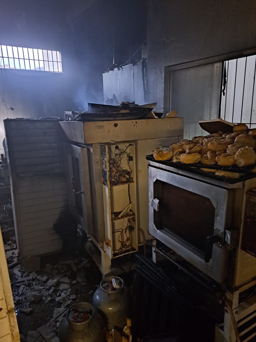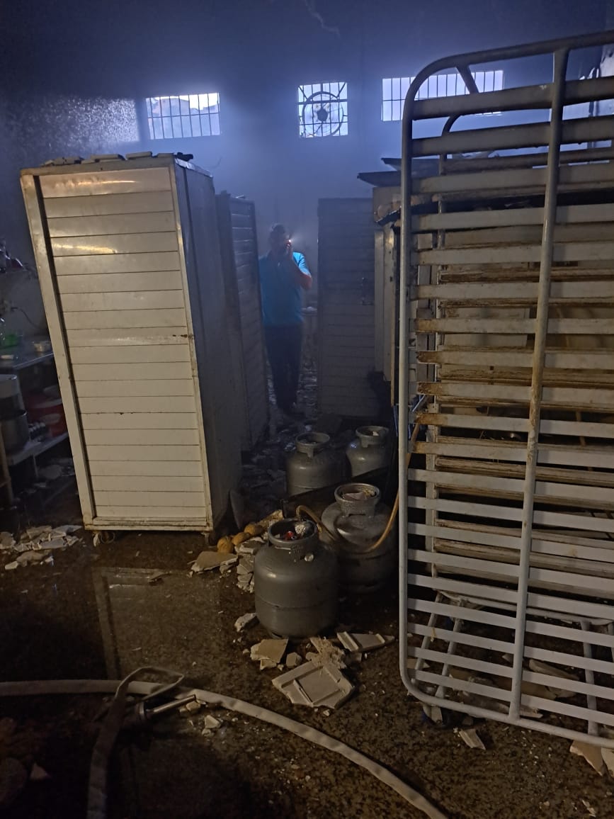 A área de produção de aproximadamente 25 metros possui cerca seis vasilhames de gás P13 entre cheios, vazios e parcialmente cheios. Os bombeiros fizeram a manipulação de um dos vasilhames que aprestava vazamento, sendo sanado o vazamento e retirado do ambiente fechado. Na análise superficial do local não foram identificadas patologias que evidenciassem danos estruturais ao prédio. Foram levantados que os danos causados pelo fogo foram uma geladeira, um armário de madeira e uma prateleira de metal totalmente destruídos. Alguns vasilhames e utensílios de padeiro destruídos e também foram totalmente queimados a mochila de um dos funcionários que relatou ter perdido seus documentos pessoais e cartões de banco.