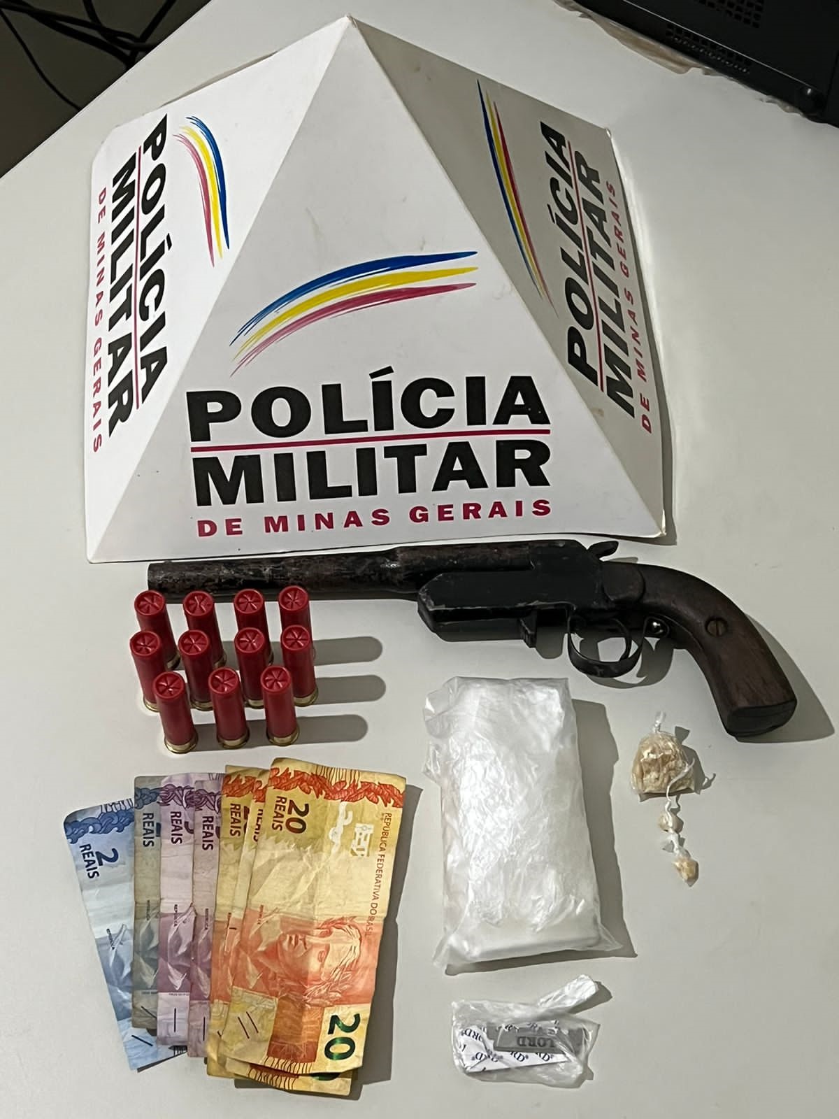 A Polícia Militar recebeu informações dando conta que indivíduos envolvidos com tráfico de drogas estariam portando armas de fogo no bairro Mangueira e haviam, inclusive, efetuado disparos. Uma equipe foi ao local e se deparou com um dos autores. Durante as buscas pessoal e residencial foram encontradas uma arma de fogo, tipo garrucha calibre 32, 11 munições do mesmo calibre, três pedras de crack, R$74,00, além materiais para separar e embalar drogas.