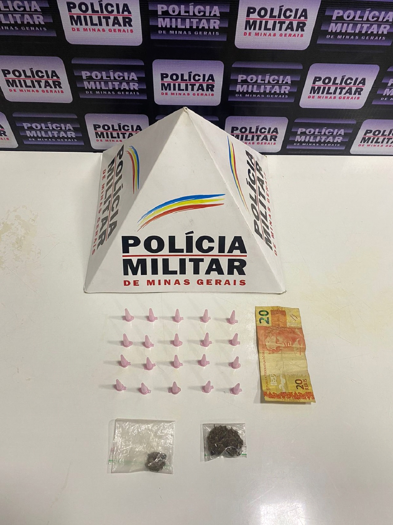 Em intensa varredura no local, foram localizados os pontos onde os entorpecentes estavam escondidos. A ocorrência resultou na apreensão de duas porções de maconha, 20 cápsulas com cocaína e 20 reais.