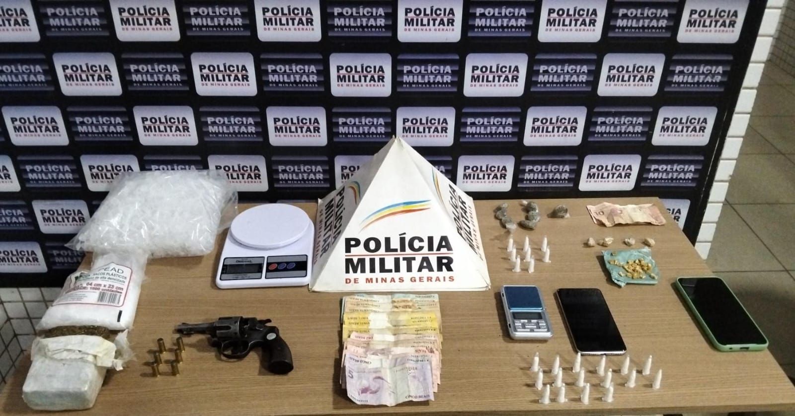 A ação policial resultou na apreensão de um revólver calibre 32 e seis munições do mesmo calibre, uma barra e sete buchas de maconha, 24 cápsulas com cocaína, 32 pedras pequenas e quatro médias de crack, 480 reais, duas balanças e material para embalar drogas.