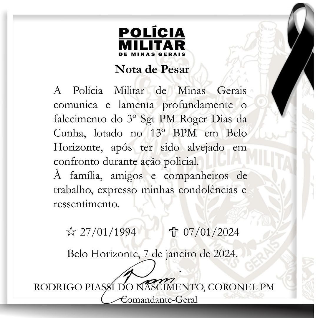 O Sargento da Polícia Militar Roger Dias da Cunha, de 29 anos, teve a morte confirmada pela Polícia Militar de Minas Gerais na noite deste domingo (7/1). Ele foi baleado na cabeça após uma perseguição no bairro Novo Aarão Reis, região Norte de BH, na noite dessa sexta-feira (5/1). O suspeito do crime e seu comparsa foram presos preventivamente.