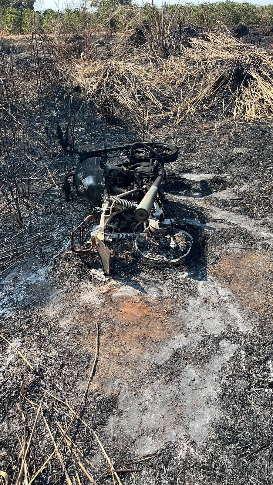 A motocicleta estava bastante danificada devido ter sido incendiada em um cafezal.
