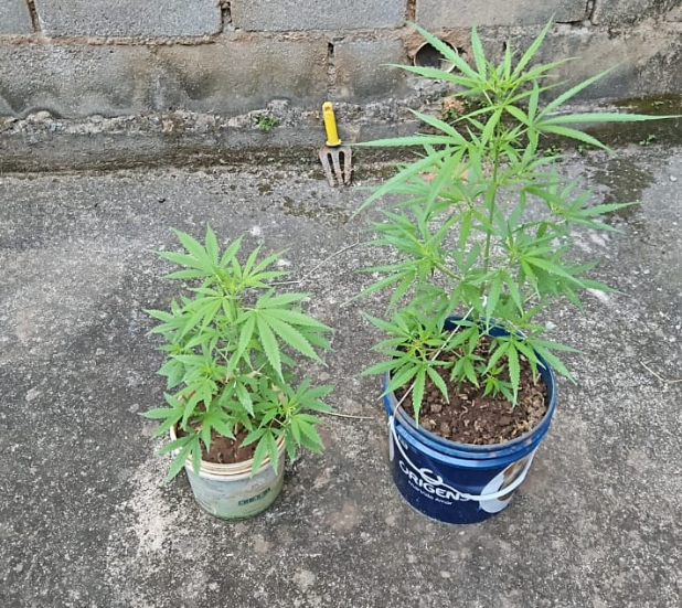 Durante a busca na residência onde o foragido foram encontrados e apreendidos dois pés e uma bucha de maconha.