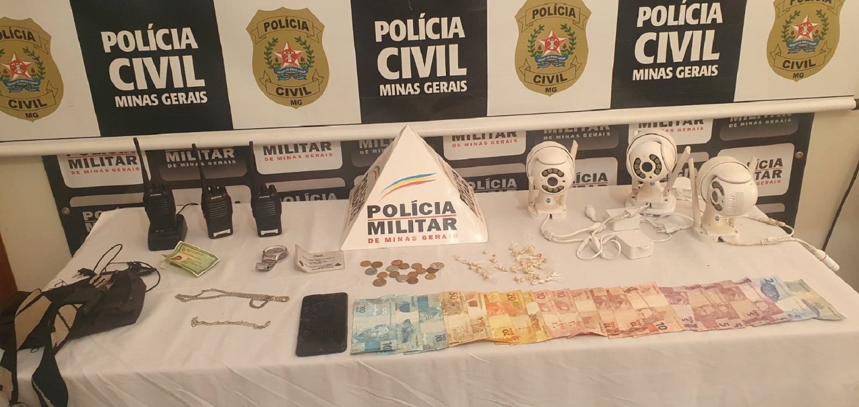 A operação contou inclusive com o apoio com cão farejador do 14º Batalhão de Polícia Militar para realização das buscas. No decorrer dos trabalhos policiais foram recolhidos três rádios comunicadores, duas balanças e 60 pedras de crack. Foi apreendido um menor de 17 anos que está com mandando de internação, que será encaminhado para Belo Horizonte.