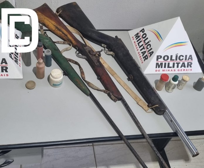 Os militares firam até a casa do idoso, e durante as buscas foram encontradas três espingardas de calibre/marca indefinidos e vários apetrechos para recarga (espoleta, pólvora, chumbo).
