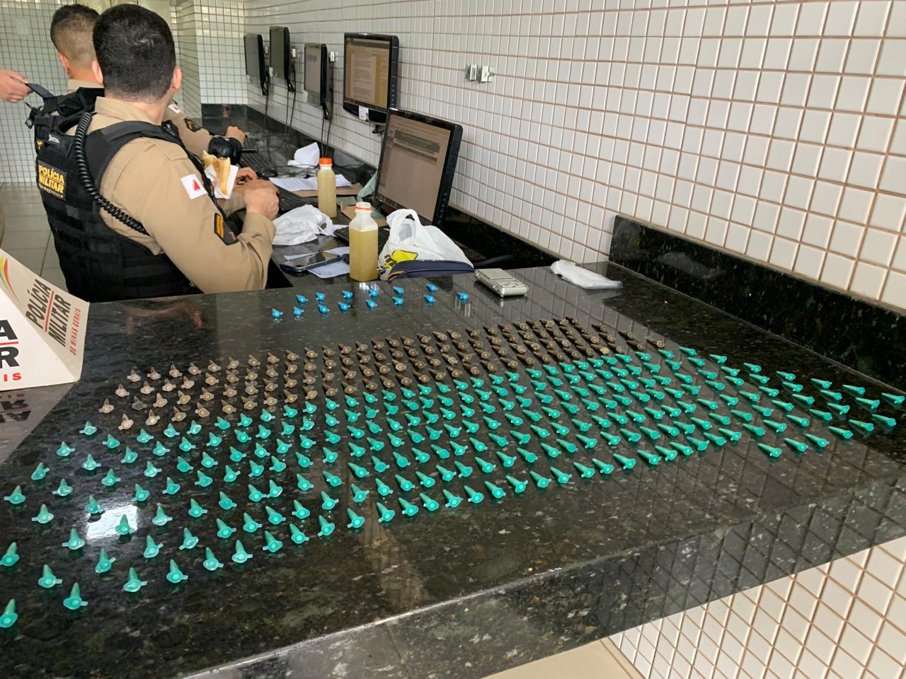 Foram aprendidos 374 pinos com cocaína, sete balanças, duas barras de maconha e mais uma porção, uma pedra de crack grande, diversos pinos vazios pra acondicionar drogas, além de R$ 538,00.