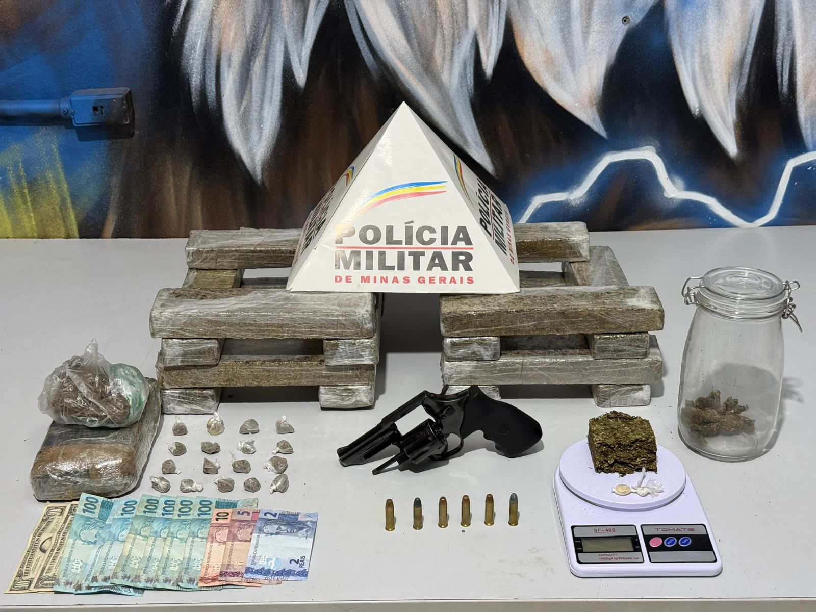 Ao todo, foram apreendidos 15 barras de maconha, totalizando cerca de 15 quilos, além de três tabletes, duas porções e 24 buchas de maconha, uma porção de crack, quatro aparelhos celulares, uma balança eletrônica, R$ 717 em dinheiro e US$ 11, um revólver calibre .38, seis munições do mesmo calibre e uma motocicleta.