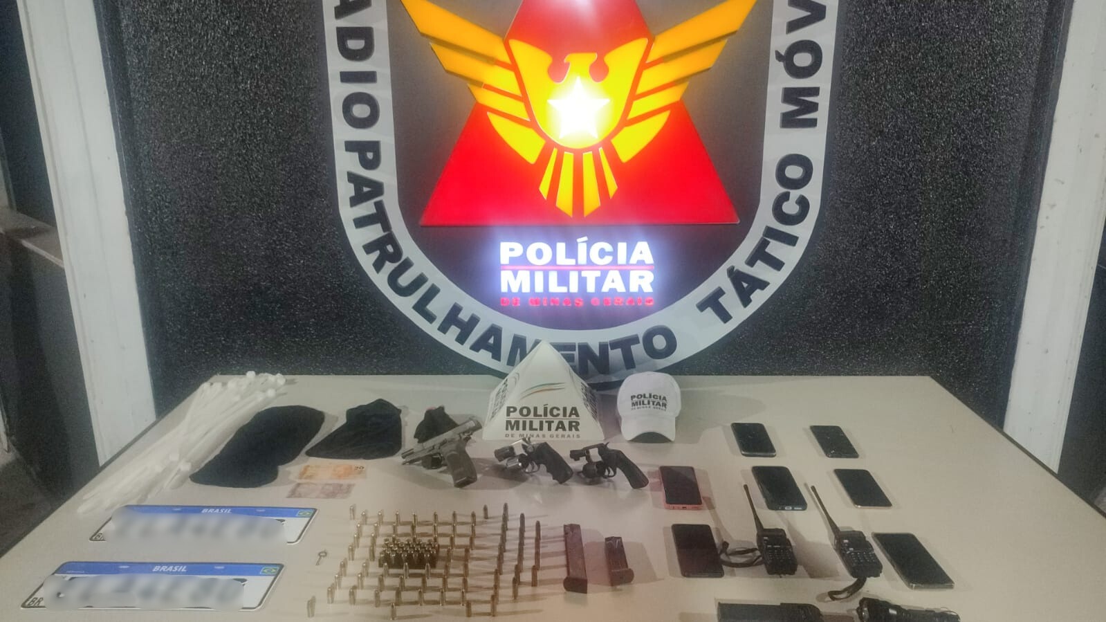 Na verificação do veículo, os militares constataram que o carro estava com placas adulteradas. No interior, foram encontrados toucas ninja, luvas, blusas, alicate, cinco celulares e um jogo de placas originais. Os três ocupantes, todos de São Paulo, foram presos.