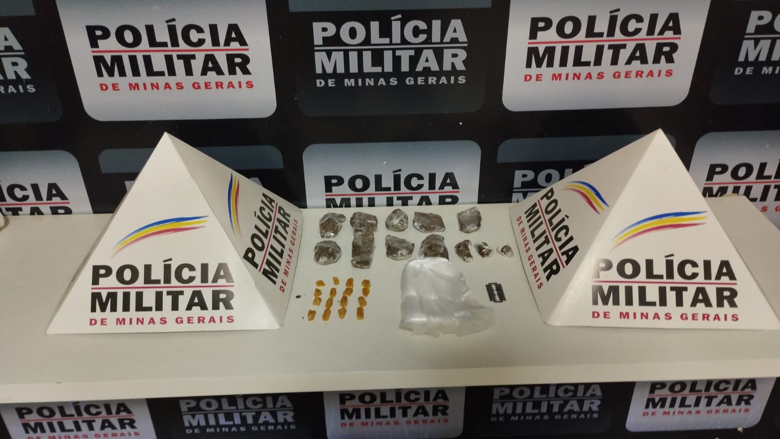 A equipe realizou buscas no local, sendo encontrados nove tabletes e dez buchas de maconha, além de 16 pedras de crack e materiais usados para fracionar as drogas.