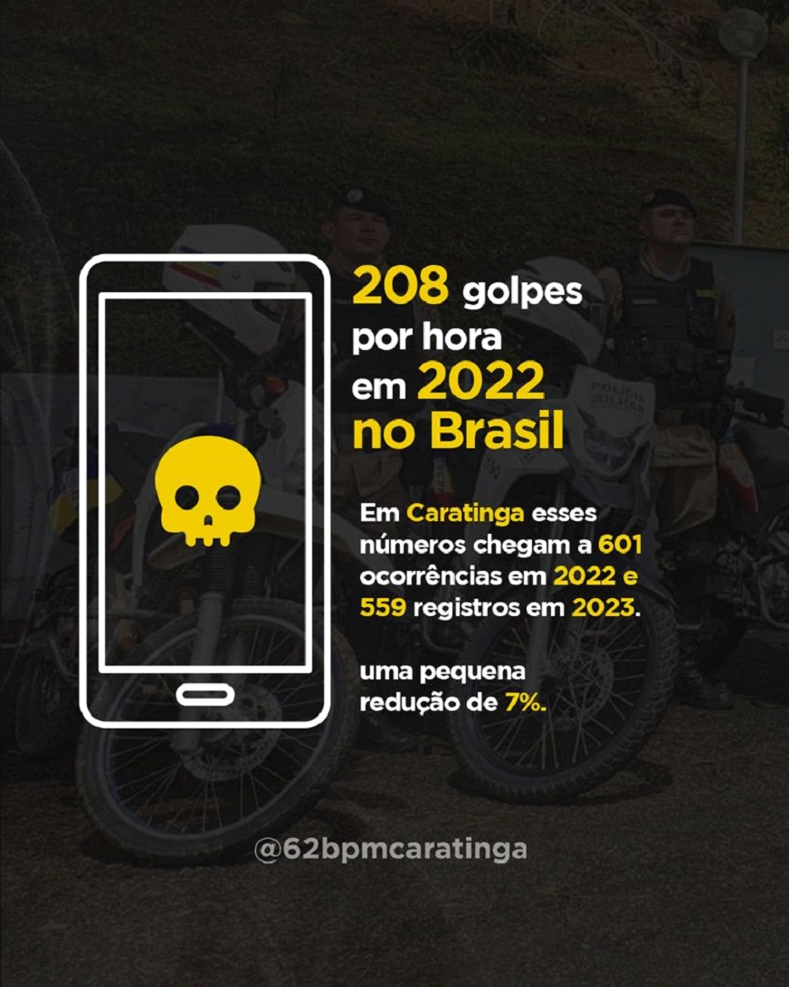 Ainda de acordo com a sargento Vívian, em Caratinga essa realidade não é diferente e a comunidade local está sendo cada vez mais afetada por esses golpes. “Na área de responsabilidade do 62º BPM foram registradas um total de 1.522 ocorrências em 2022 e em 2023 1.527 ocorrências, um pequeno aumento. Em Caratinga esses números chegam a 601 ocorrências em 2022 e 559 registros em 2023, o que representa uma pequena redução de 7%, porém, em análise dos dados verifica-se ainda um número muito alto de registros”.