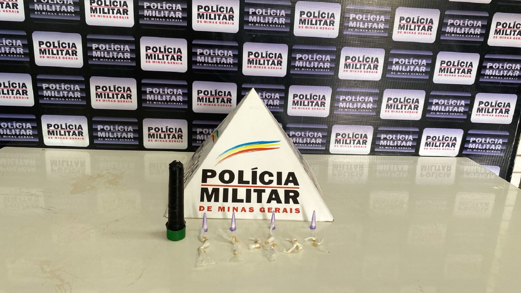 Diante da situação e considerando as denúncias sobre atividades de tráfico de drogas na área, os policiais procederam com a abordagem. Durante a revista, foi encontrado com o suspeito um tubo de aproximadamente 10 centímetros, envolto em fita isolante, contendo 18 pedras de crack, além de quatro pinos de cocaína. O jovem alegou ter encontrado o material no chão.