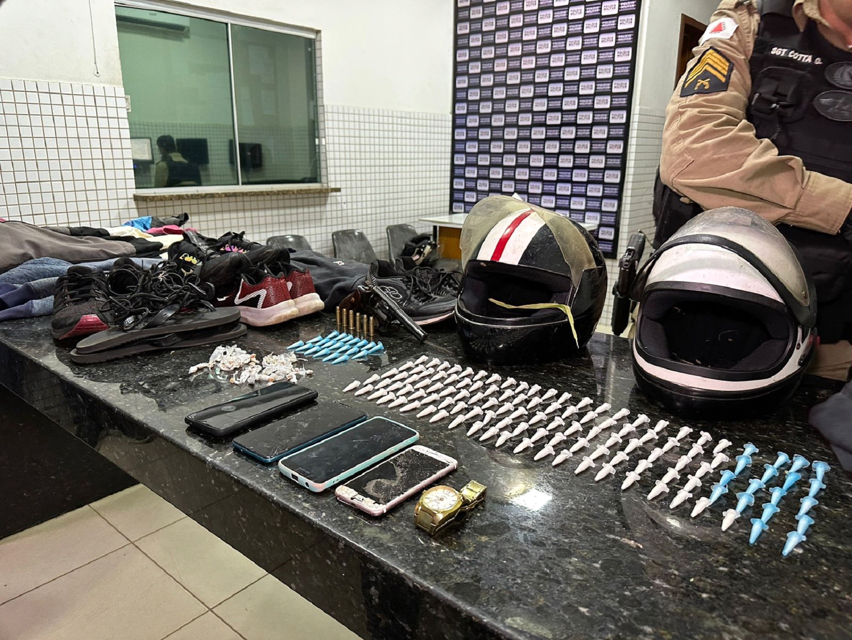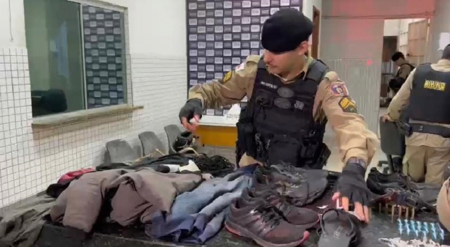 No local foi localizada escondida em meio a vegetações a motocicleta XRE cor prata, produto de roubo, além de roupas utilizadas por autores em vários roubos na cidade de Caratinga e Santa Rita de Minas, uma bolsa que no interior continha substâncias entorpecentes, capacetes de cor branca e preto com listra branca e vermelha, pares de tênis e relógio utilizados nas práticas dos roubos.