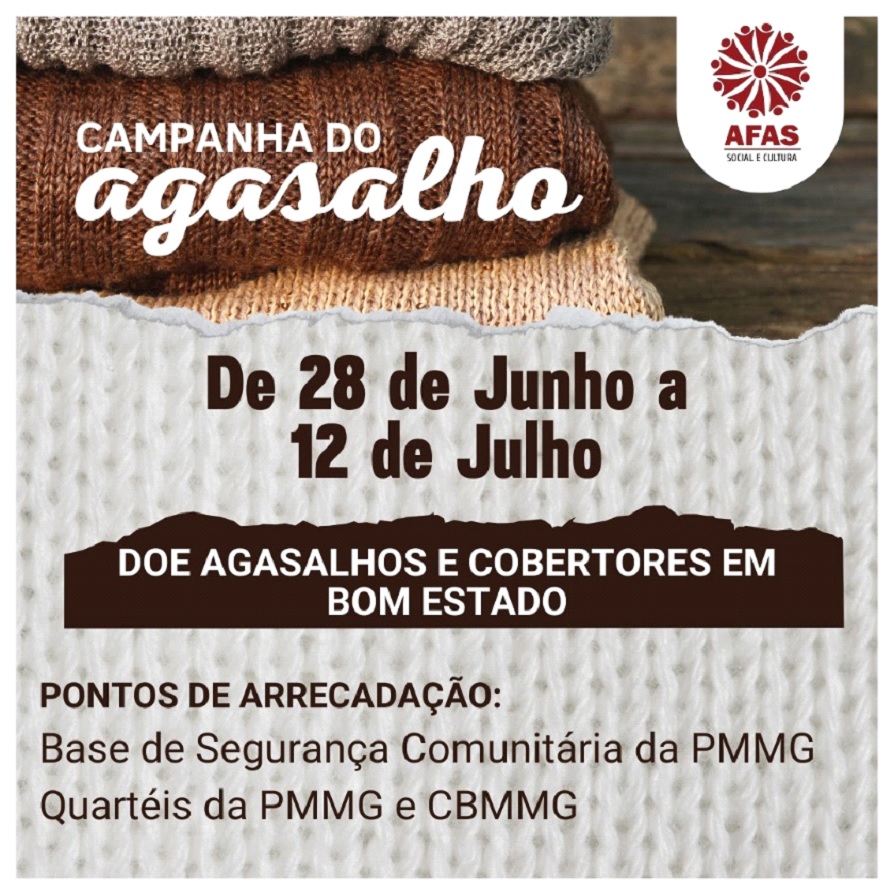Segundo o sargento Quirino, através da AFAS (A Associação Feminina de Assistência Social e Cultura), a PM idealizou essa campanha que está sendo feita nos 853 municípios de Minas. “A intenção é arrecadar o máximo possível de agasalhos em bom estado de conservação, novos e também cobertores”, disse o militar.