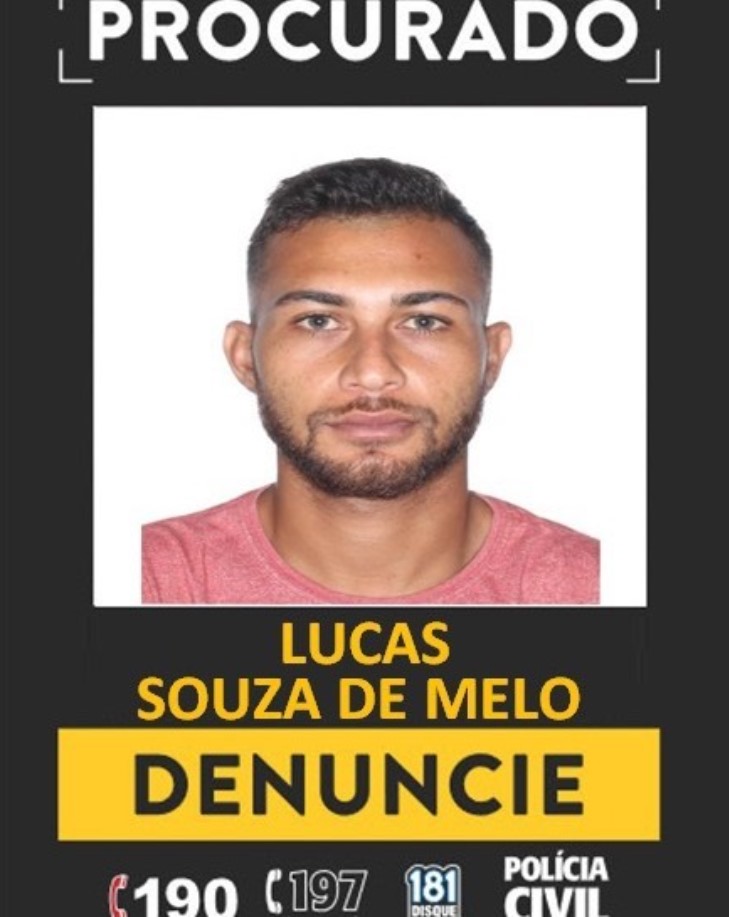 LUCAS SOUZA DE MELO, 28 anos, indiciado pela prática dos crimes de homicídio qualificado, fraude processual, posse irregular de arma de fogo de uso permitido e porte ilegal de arma de fogo de uso restrito. Encontra-se foragido da justiça com mandado de prisão pendente de cumprimento.