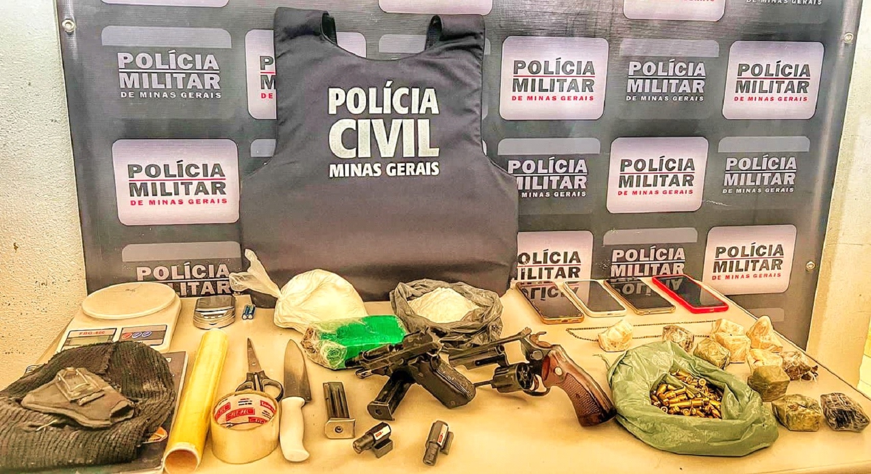 Durante a operação, ao todo, foram apreendidos uma barra de maconha, duas balanças, um rolo de papel filme (comumente utilizada para endolamento e posterior revenda de drogas), uma touca ninja (comumente utilizada para prática de crimes), um coldre de arma de fogo, um tesoura, uma faca, duas sacolas com quantidade expressiva de cocaína, quatro celulares, um caderno de anotações referentes ao tráfico de drogas, dez pedras de crack, dois tabletes de maconha, um rolo de fita adesiva (comumente utilizada para endolamento e posterior revenda de drogas), 72 munições calibre 380, dez munições calibre 38, três munições calibre 357, um revólver calibre do mesmo calibre, uma pistola calibre 380 marca, dois carregadores de pistola calibre 380, duas miras laser, um cordão aparentemente de ouro, um veículo e dois cartões de banco.