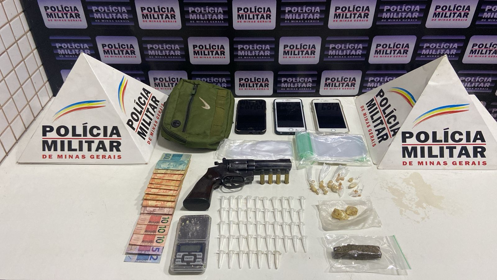 CARATINGA- Três indivíduos, com idades entre 23 e 24 anos, foram presos em flagrante na noite dessa quarta-feira(12)no bairro Santa Zita, após denúncia de que estariam manuseando ostensivamente uma arma de fogo ao lado de um veículo. De acordo com informações da Polícia Militar, uma denúncia foi recebida na central de operações relatando que três pessoas estavam com uma arma de fogo próximas a um carro Gol azul, na Rua Luiz Antônio Bastos Cortes. Ao chegar no local indicado, os militares avistaram o veículo descrito estacionado, com três indivíduos em seu interior. Durante a abordagem e busca pessoal, foram encontrados com os suspeitos quatro cartuchos intactos, um revólver calibre .38, um tablete de maconha, 47 microtubos de cocaína, 26 pedras de crack, uma balança de precisão, três aparelhos celulares e R$ 937,00 em espécie. Os três homens receberam voz de prisão em flagrante por tráfico de drogas e porte ilegal de arma de fogo. Eles foram encaminhados à delegacia de Polícia Civil para registro da ocorrência.