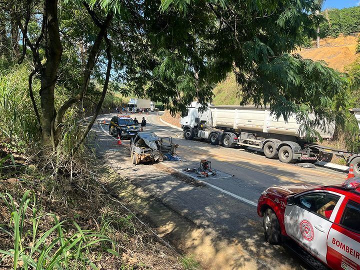 a Uma pessoa morreu após um grave acidente entre duas carretas e um carro de passeio, neste sábado (11), na BR-262, em Ibatiba.