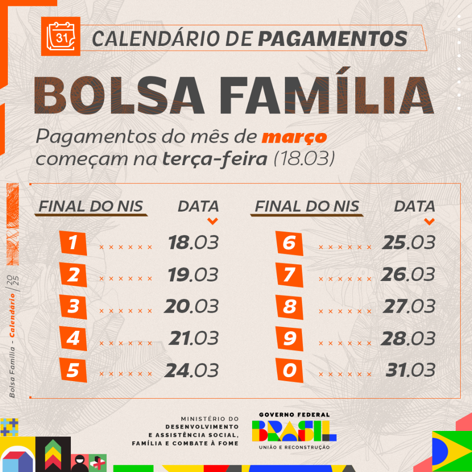 Os pagamentos seguem o calendário e acontecem de acordo com o último dígito do Número de Identificação Social (NIS), sempre em dias úteis, iniciando com aqueles de final 1 e indo até os de final zero. Em março, as transferências terminam no dia 31.